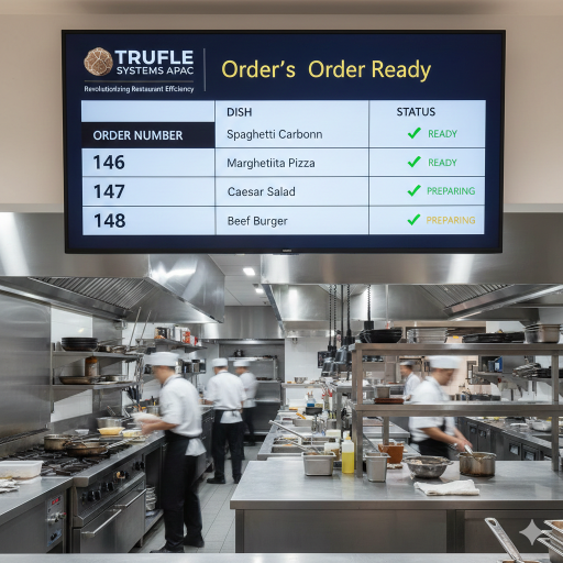 Furthermore, Truffle Systems APAC’s order ready screen display can be customized to suit the specific needs of each restaurant. Whether it’s color-coding orders based on priority, displaying special instructions for dietary restrictions, or integrating with existing POS systems, the technology is highly adaptable and can be tailored to enhance workflow efficiency.
